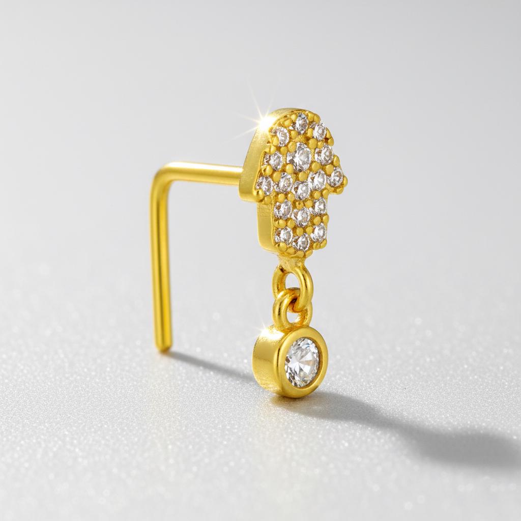 Sterling Silver Hamsa Hand with Dangling CZ L-Shaped Nose Ring