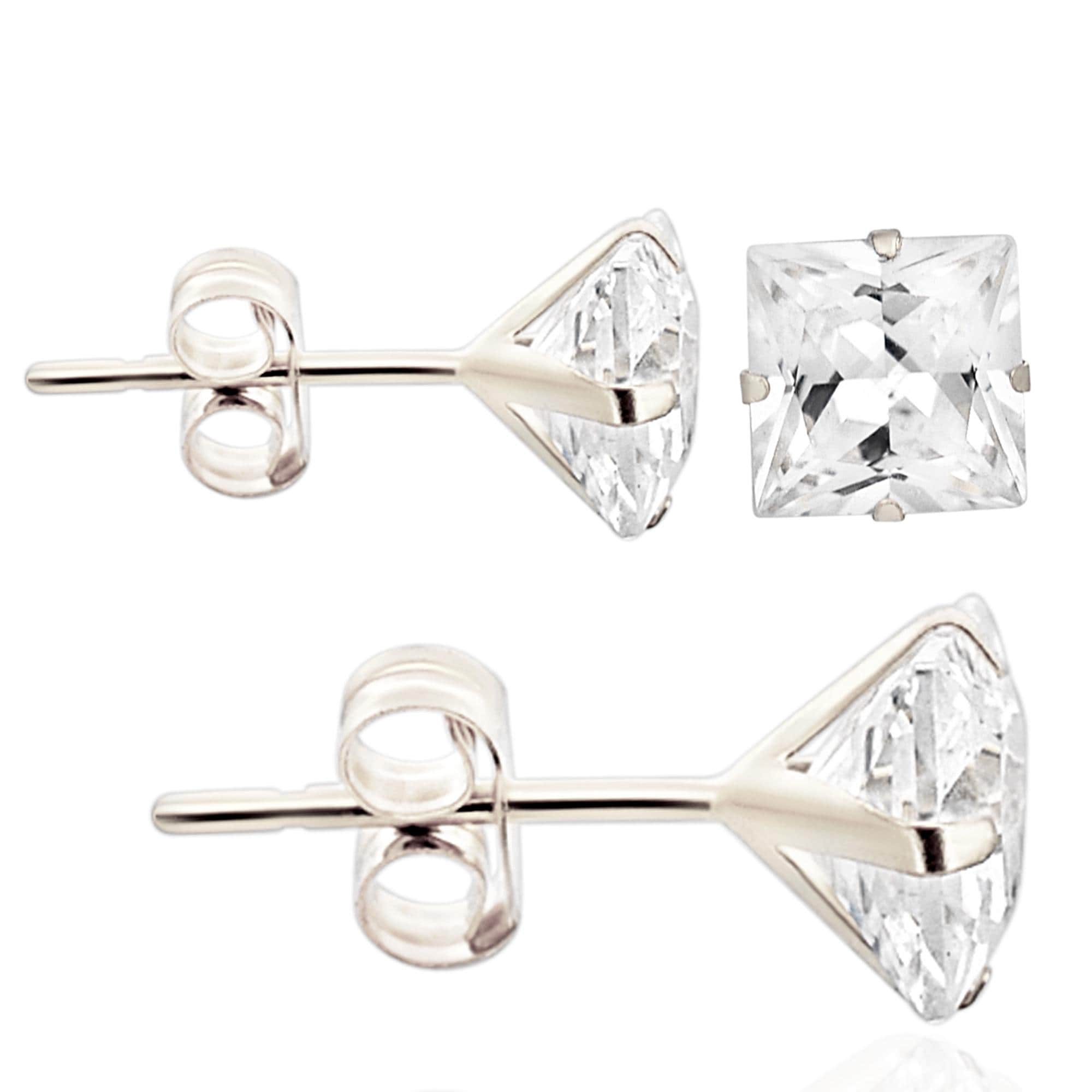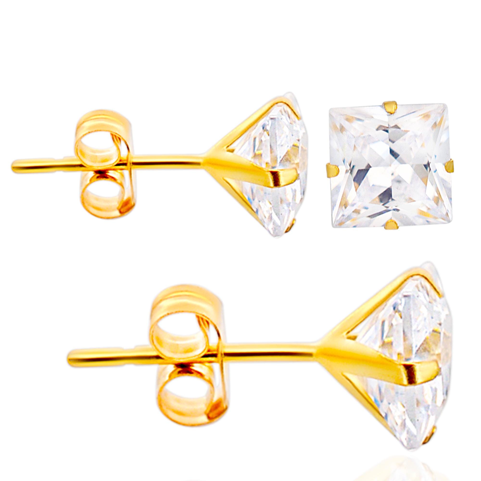 These 14k gold classic and elegant round-cut stud earrings will match any outfit and can be worn in any special occasions. Hand-made and set with clear square cubic zirconia crystals in stamping four prong settings will provide the effortless glamour that you need any time and any day.